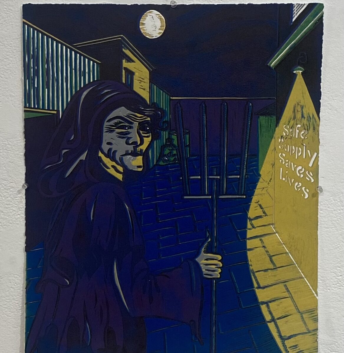 Ophelia Payne has chosen to depict Pesta sweeping through a dark alley with her rake. This seven-colour linocut reduction will be sold with proceeds going to Street Cats YYC.